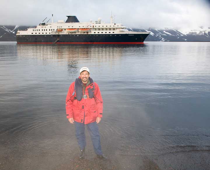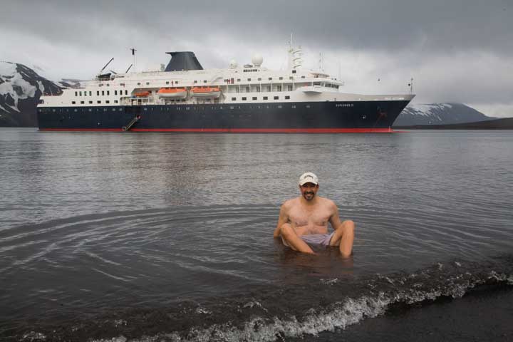 Our first time on Antarctic terra firma. You can see the steam rising around me from the thermals at the waters edge.