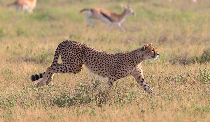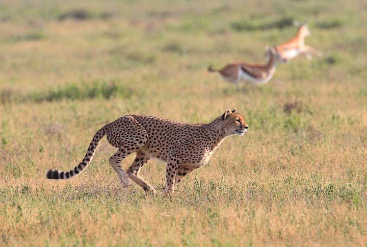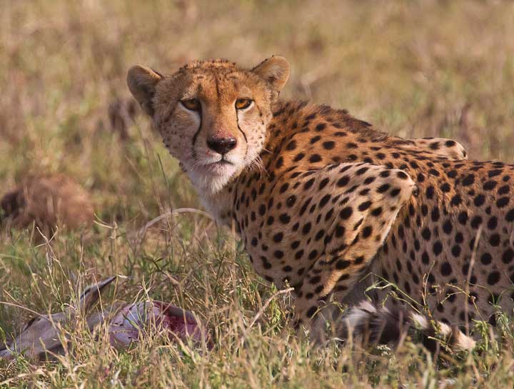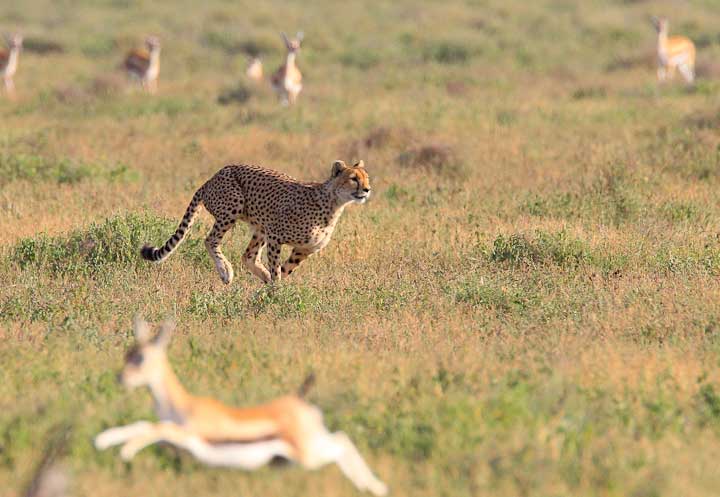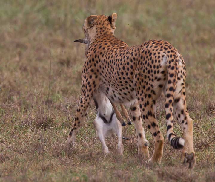 Cheetahs tend to be daytime hunters, and with their beautiful markings and haircoats make good photographic subjects. In February of every year they take advantage of the easy pickings of very young Thompson and Grant’s gazelle, along with wildebeest calves and zebra foals. This is an ideal time to teach young cheetah how to hunt.