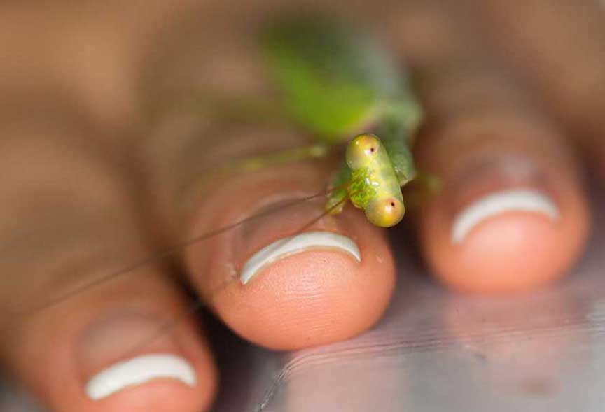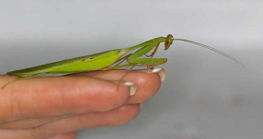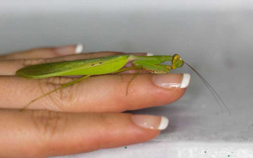 Before we went to bed a sociable Praying Mantis made friends with Jade and then promptly fell asleep on her hand!