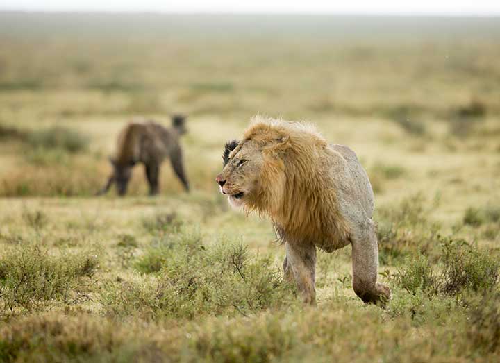 Hyenas have powerful jaws, and in sufficient numbers are not usually afraid of lions, especially lionesses. This is not the case when a large male lion approaches.