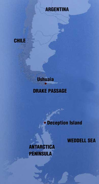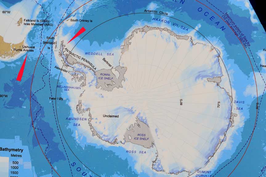 On our voyage we spent all our time in the Antarctic peninsula, which is just a tiny sliver when compared to the whole continent. The large red arrows point to Ushuia, our starting point, and the Antarctic peninsula.