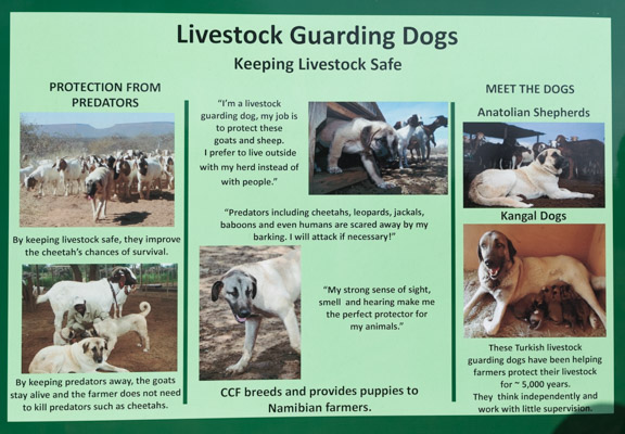 She imports and breeds Anatolian shepherds from Turkey. These are large herding dogs that are not afraid of cheetah. The program is working, and now the CCF breeds them, trying to keep up with the number of goat herders that are on a waitlist for one of these dogs.