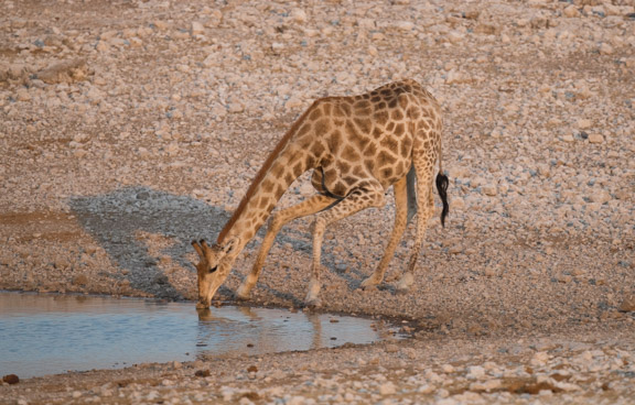 The action at Etosha was at the waterholes. Notice this giraffe’s front leg technique in order to lower its head to drink