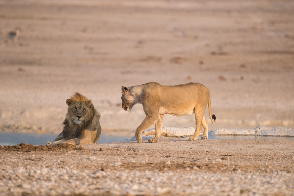After a short while a playful lioness walked past the male for a drink