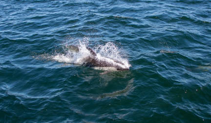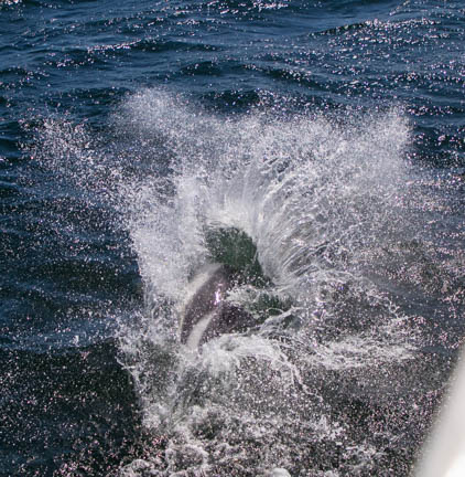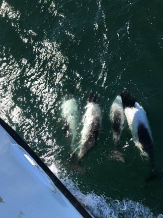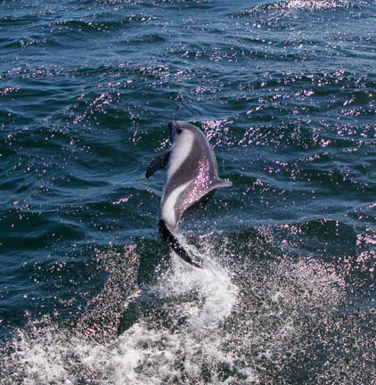We had visitors as soon as we motored away. These are Peale’s dolphins, found almost exclusively in this ocean. They live along the coastal waters, eating a wide variety of fish, crustaceans, mollusks, and octopus. Being dolphins, they are playful, and they surfed our bow wave for hours, entertaining us with their jumping and spinning out of the water.