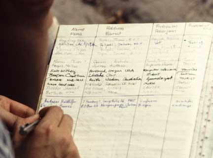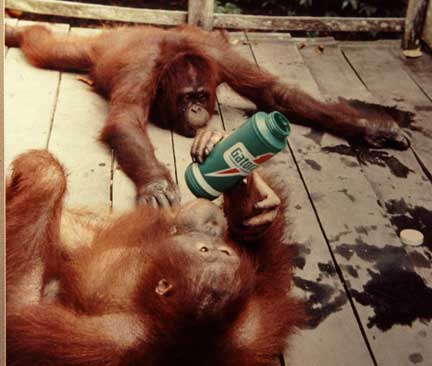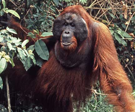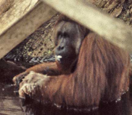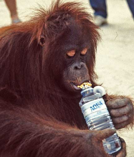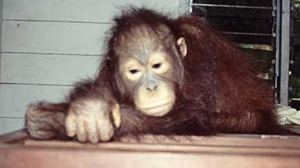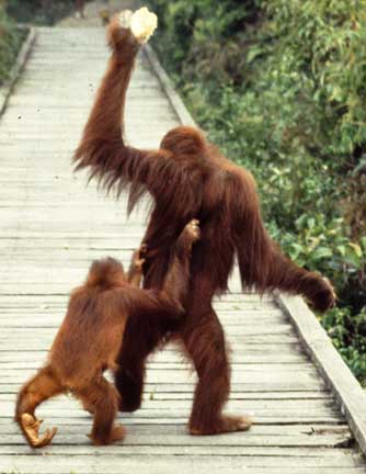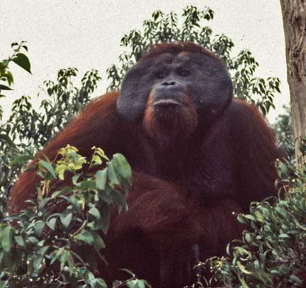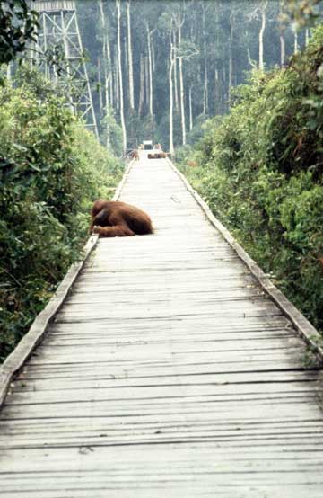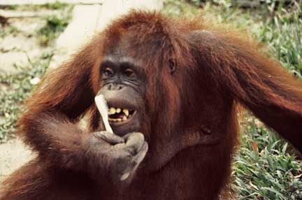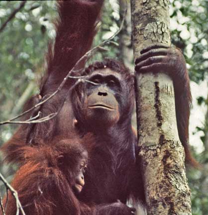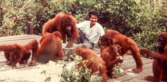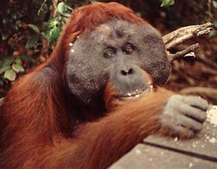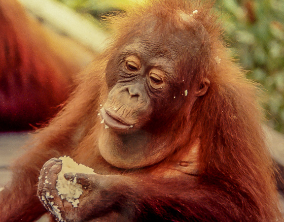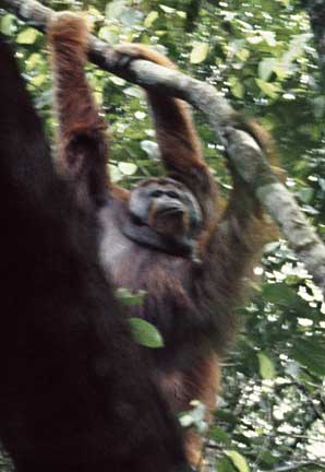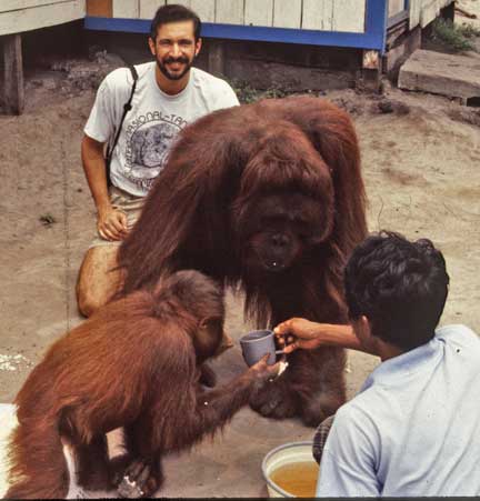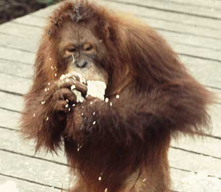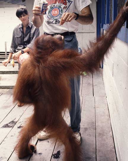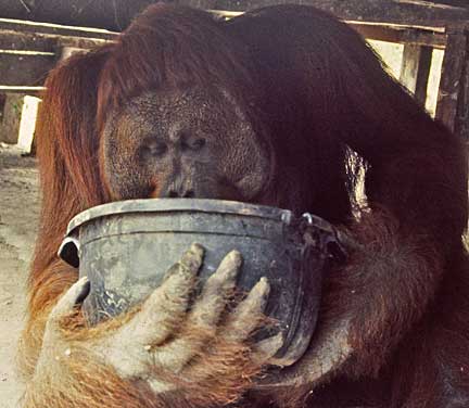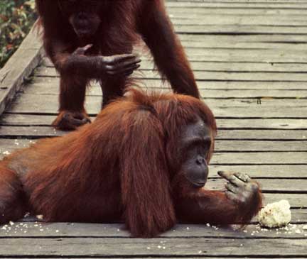 Some of the best photographic opportunities occur around camp when orangutans that have been recently confiscated in Jakarta and Singapore, and released at camp Leakey, return once daily for a free meal of rice and milk. This was an important meal since they did not yet have the knowledge to meet all their nutritional needs on their own. The large males have this knowledge, and it takes time for these females to assimilate this information.