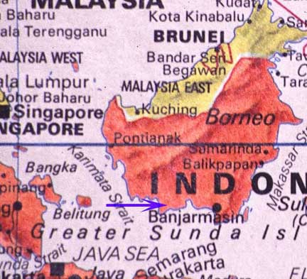 Borneo is the 3rd largest island in the world and is made up of three countries; Indonesia, Malaysia, and Brunei. Of the three, Indonesia by far makes up the largest segment (the orange area on the map below), and is called Kalimantan. The blue arrow on the map below denotes the location of the research project, called Tanjung Puting National Park. It is in a camp called Camp Leakey, named after the famous anthropologist Lewis Leakey.