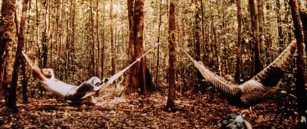 The jungle is hot and humid, and if we came across an orang we would put up our hammocks and observe in a more comfortable manner