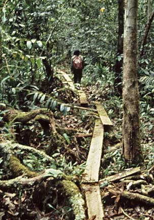 This dayak is leading the way over wooden planks out of the camp. They are a huge help during the rainy season when the water is do deep you cannot see where you are walking.