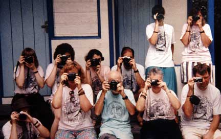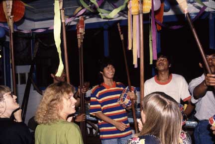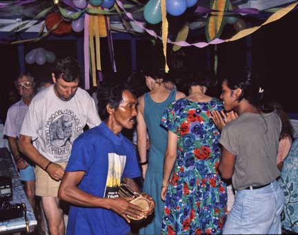 We spent the next several hours dancing to many local songs. The small man in front is in charge of the camp, and is the same man you saw earlier giving the huge male orang a cup of coffee. He weighs about 90 pounds, and all the orangutans run from him.